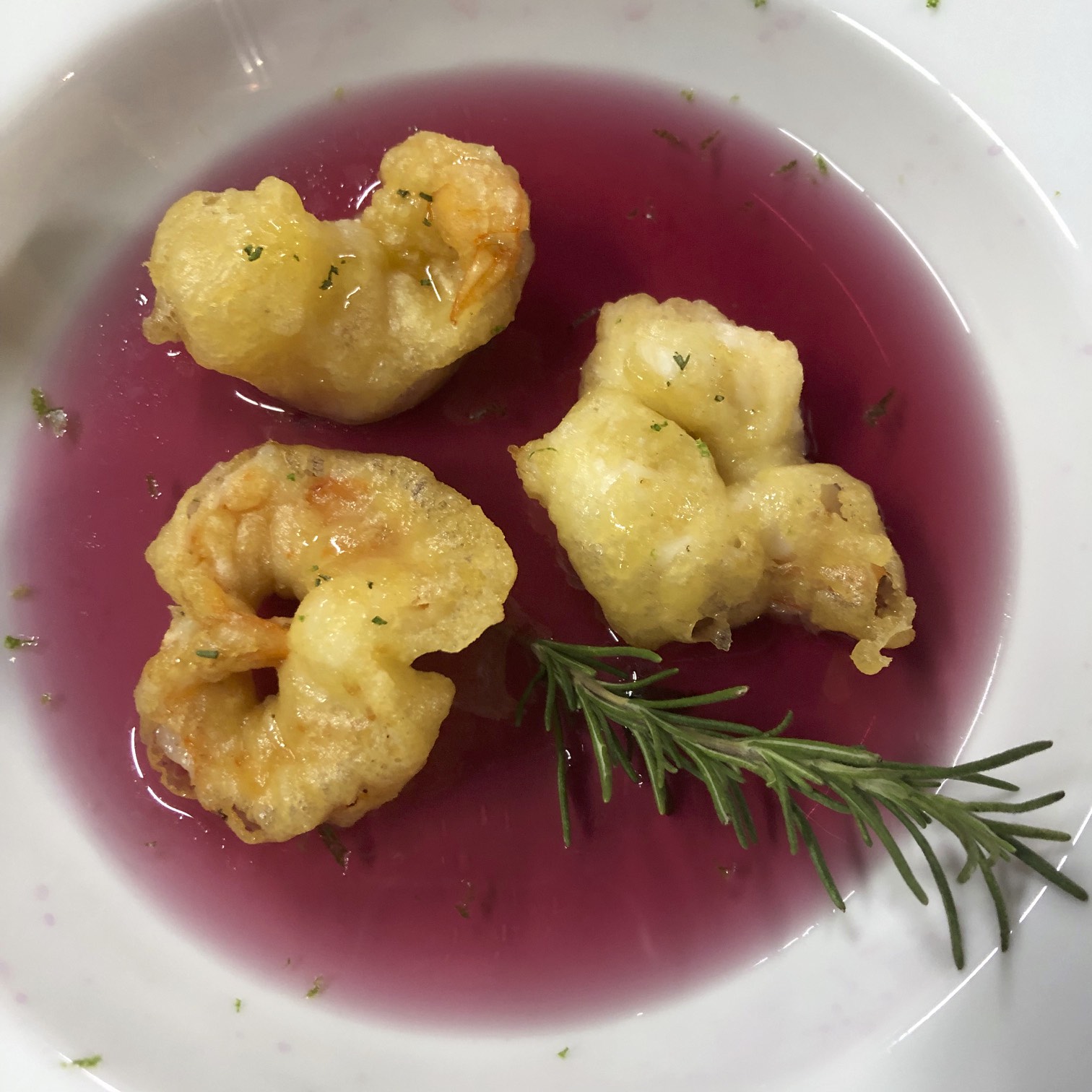 TEMPURA FRIED SHRIMP SERVED IN A BATH OF ROSE WATER AND TOPPED WITH ROSEMARY HONEY SAUCE.
